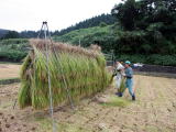 今から思うと手刈りで稲を刈り、はさ掛けをしていた時代が懐かしいですね。我が家にとっては一年に一度の大イベントの日。子供ながらに家の仕事を手伝ったという充実感。家族総出の農作業。親子のコミュニケーションの場。親父やお袋の働く姿。作業内容や段取りをめぐっての親父とお袋の喧嘩。秋晴れの下、稲刈りの休憩時に食べた自宅の畑で取れた季節はずれの甘くないスイカの味。稲を積んだトレーラーの上に乗っての移動。稲わらの匂い。台風で倒れたはさの無残な姿・・・・・・・・。いろいろな思い出が稲刈りに詰まっています。大人にとっては、稲刈りはたいへんだったと思いますが、子供にとってはなんだかお祭り気分だったような気がします。