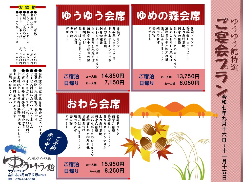 ゆうゆう館のご宿泊・宴会メニュー(2025秋)令和7年11月15日まで